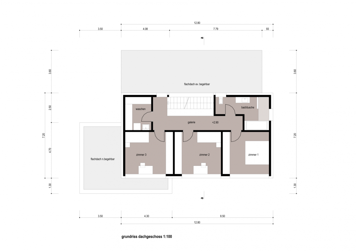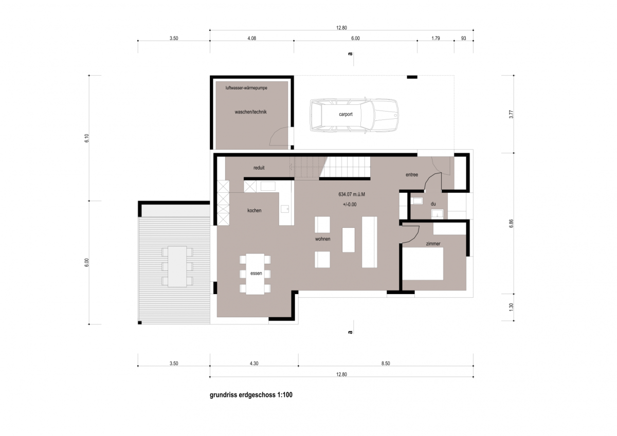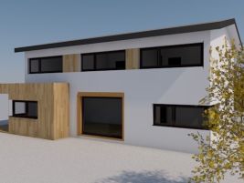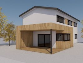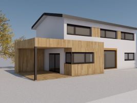 Dieses Haus besticht durch eine perfekte Synthese aus Holz und Beton. Der geradlinige Bau endet in einem wahren Blickfang, einem Vorplatz aus Holz. Grosszügige Räume im Obergeschoss bieten grosse Wohnqualität. Die Planung schlägt ein Satteldach vor. Es kann aber auch durch ein Pultdach ersetzt werden.