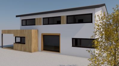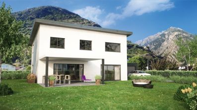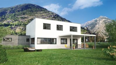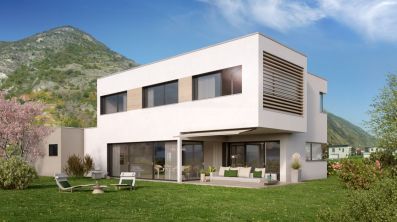 Dieses Haus besticht durch eine perfekte Synthese aus Holz und Beton. Der geradlinige Bau endet in einem wahren Blickfang, einem Vorplatz aus Holz. Grosszügige Räume im Obergeschoss bieten grosse Wohnqualität. Die Planung schlägt ein Satteldach vor. Es kann aber auch durch ein Pultdach ersetzt werden.