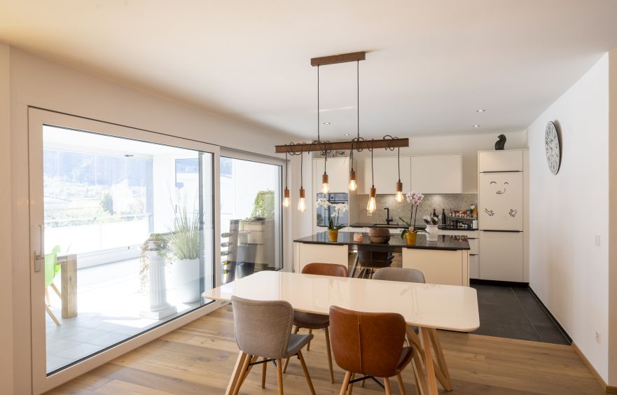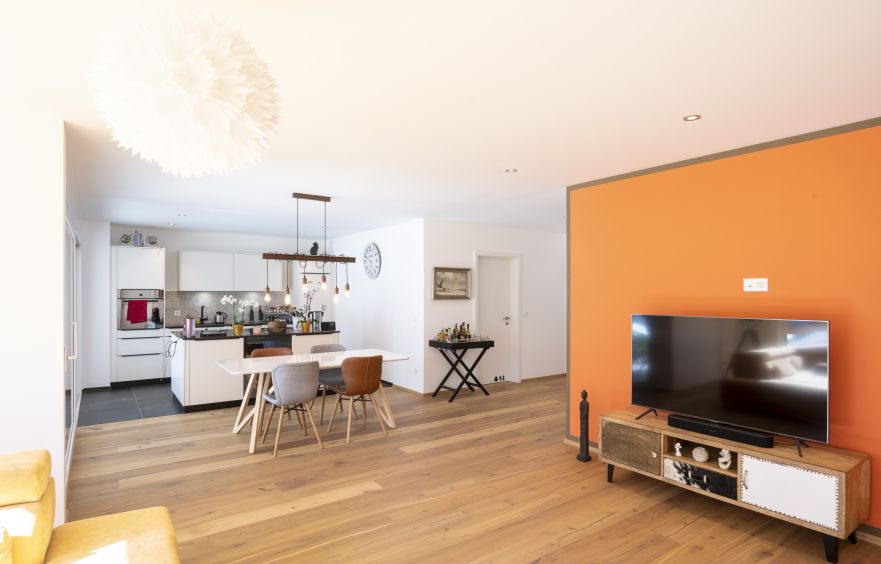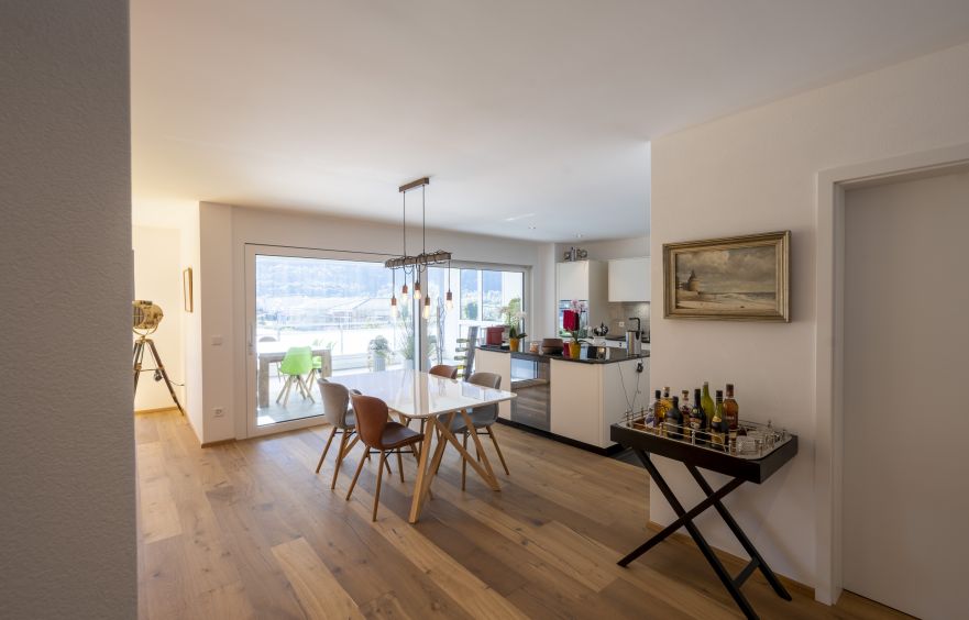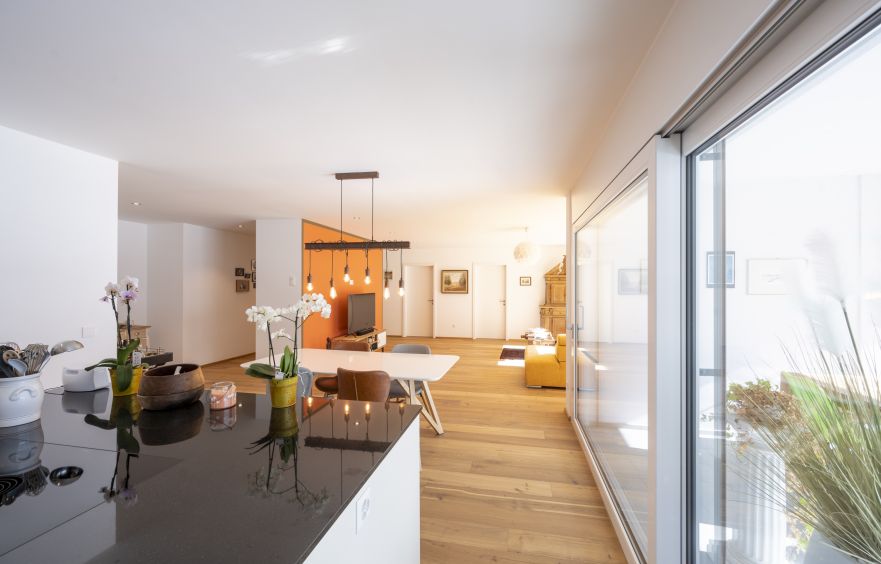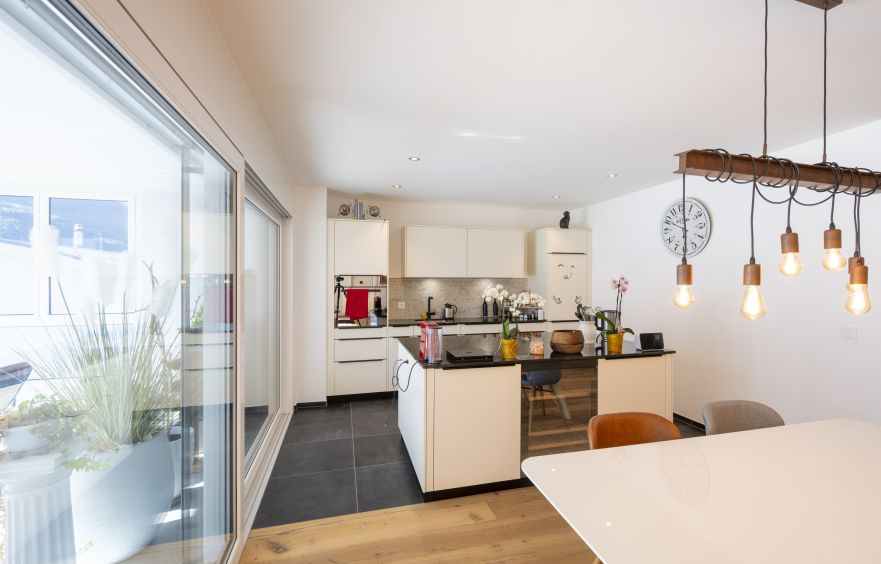 Küche mit Kochinsel, Esszimmer und Wohnzimmer sind offen. Zur Wohnung gehören ein Keller, eine Garage und ein Parkplatz.