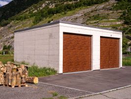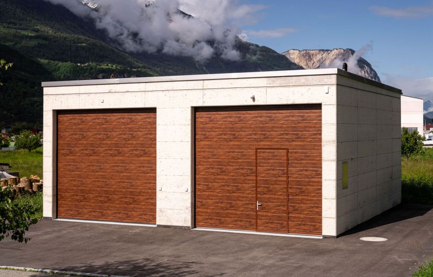 Grosszügige Doppelgarage in Sichtbetonkonstruktion, die sich sowohl als Einstellplatz wie auch als Arbeitsplatz eignet.