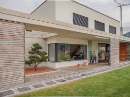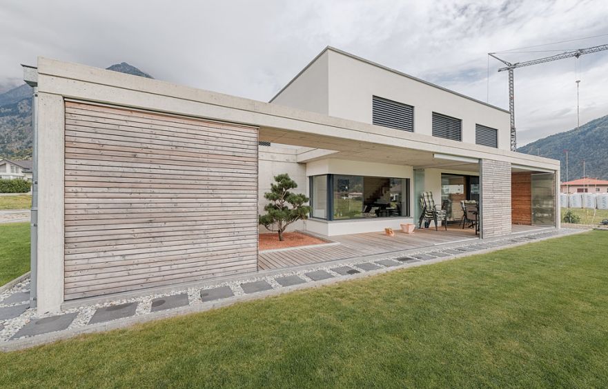 Das Einfamilienhaus besticht durch eine spezielle Südfront. Die Balkonwände und der Balkonboden sind aus einer hochwertigen Lärchenholzkonstruktion gebaut. Die 5 1/2 Zimmer sind auf zwei Etagen erstellt. Durch die integrierte Garage im Erdgeschoss erreicht man einen offenen und lichtdurchfluteten Wohn- Ess- und Küchenkomplex.
