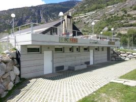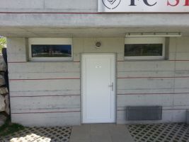 Der Kabinenneubau des FC Steg wurde in Sichtbeton mit Tafelstruktur erstellt. Die Flachdachkonstruktion mit Zementplatten als Abschluss, dient als grosse Terrasse.
